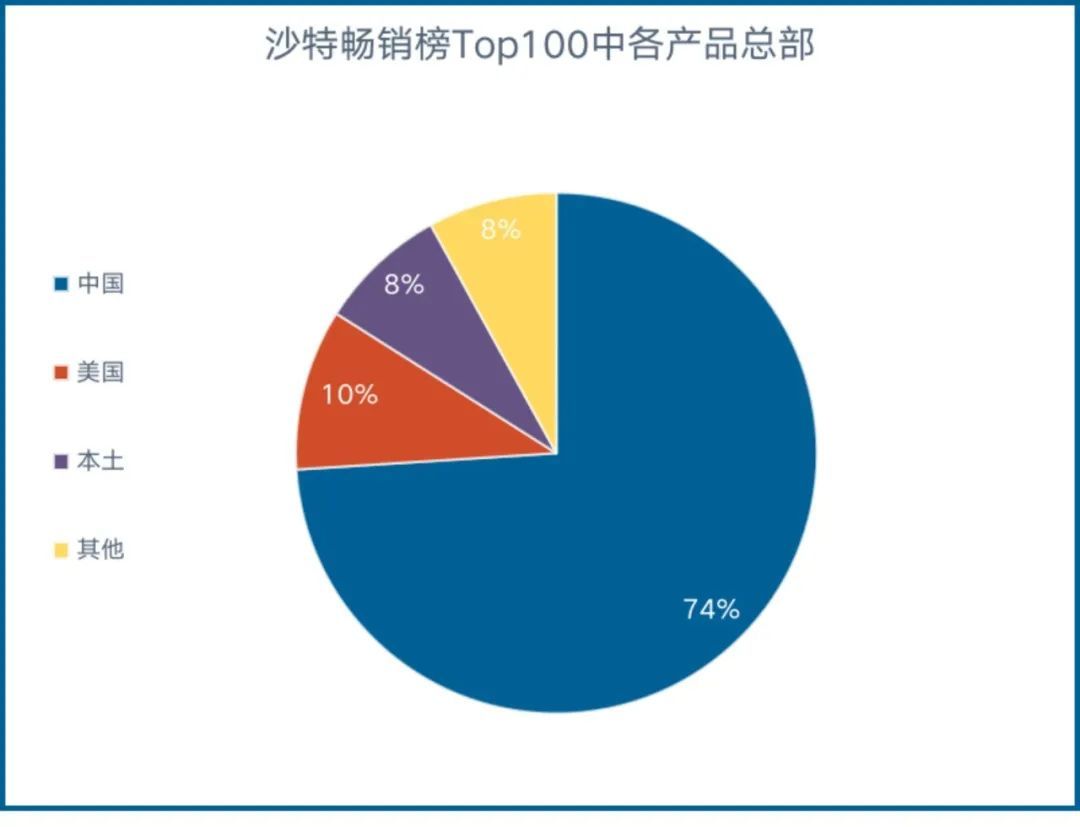 以沙特市场为例,在沙特畅销的 50 款 App 中,74% 的产品总部在中国、10% 在美国、8% 来自沙特/阿联酋等中东本土国家,余下 8% 来自印度/韩国等其他国家。在其他中东国家,虽然会有细微差别,但基本盘大体类似。