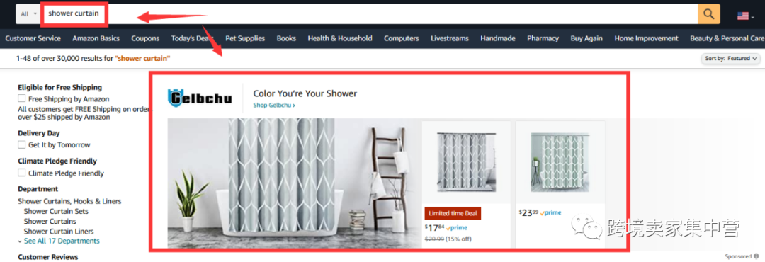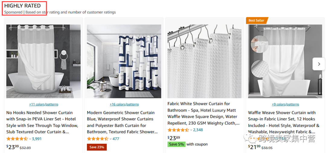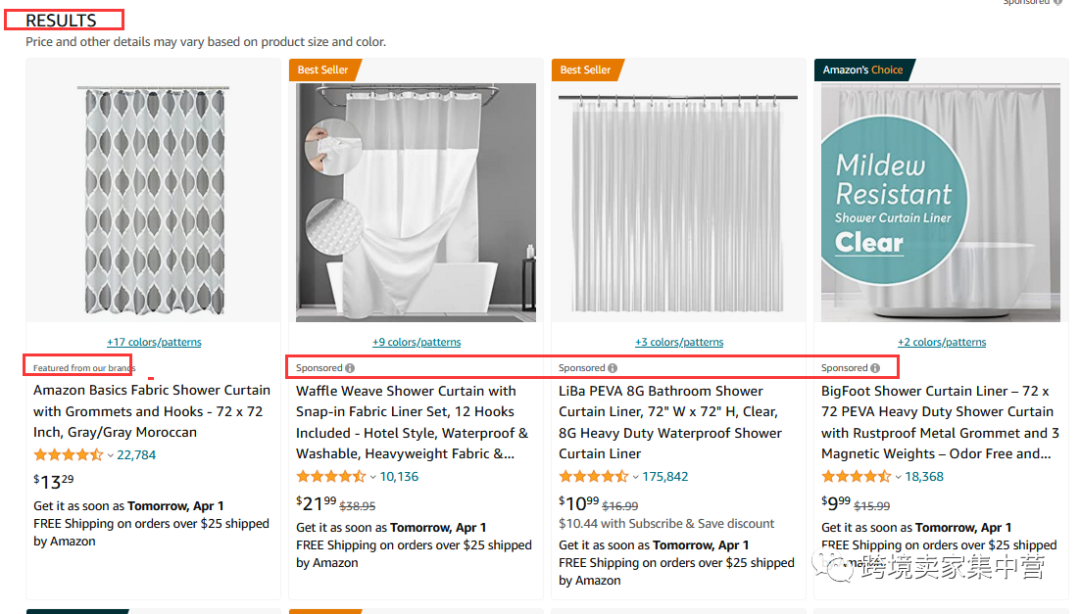 首先,我们在打开亚马逊的搜索前台,输入"shower curtain"这个关键词,在关键词搜索结果的最上面,这个是头条广告的位置,品牌卖家都可以去竞争每个关键词的这个头条位置。