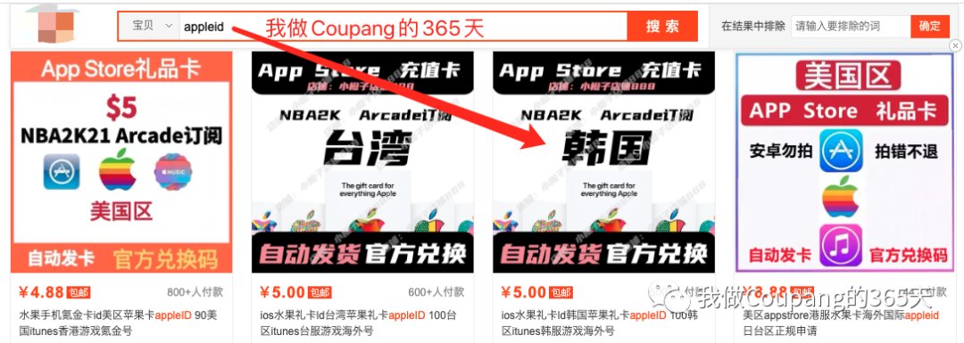 1、前往某宝,搜索【appleid】,找到出售韩国apple id的商家,进去购买。