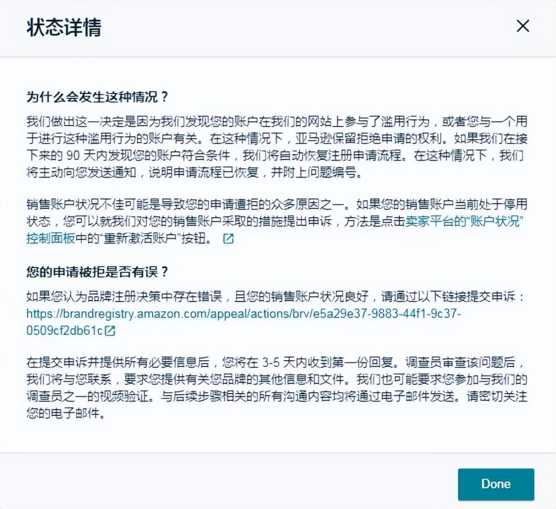 亚马逊表明:该卖家的申诉行为违反了亚马逊品牌注册政策,并且已经将账户从品牌注册中移除。同时撤销对品牌注册的所有访问权限,卖家以后将无法通过任何其他方式重新申请或重新获得访问权限。