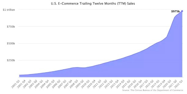 根据美国商务部的数据,过去12个月的美国电商销售额达到9750亿美元。三年前,这一数字为5180亿美元,当时,市场规模实现翻番整整经历了七年时间。十年前的这个时候,美国电商年销售额仅为2080亿美元。