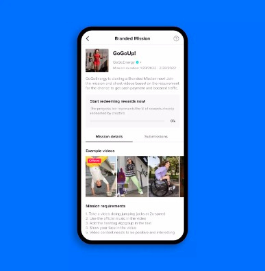 Branded Mission允许创作者与品牌建立联系,如果创作的视频被选中,他们将获得广告收益。在品牌商选择内容是否适合广告放大之前,创作者最多可以提交三个视频。这些创作者必须年满18岁且至少有1,000名关注者。