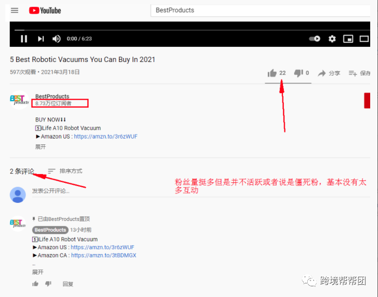 这位博主的粉丝量就有27W,但是他的出品很多,一个月有15条视频,浏览量很少,点赞少,互动少。视频整体质量不如预期,仔细找找就会发现,同类型的博主找一找,好出品好效果的非常多。这种一个月出品多的还有一个通病就是一个人运营多个YouTube账号,买的粉丝,上的视频内容是一样的,比如说我明明找了两个博主,还交了两份钱,但是两个博主其实是同一个人,他们把同一个产品做一样的视频发布到不同频道里面,坑真大