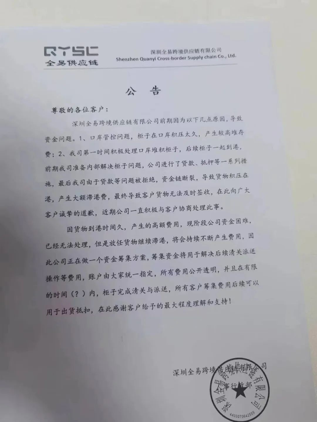 公告内容显示,全易资金链断裂有以下原因:口岸管控问题,柜子在口岸积压太久,产生了较高的堆存费;该公司在准备内部解决柜子问题时,进行了贷款、抵押等一系列措施,但最后由于贷款等问题被拒绝,最终导致资金链断裂,货物积压在港,并产生了大额的滞港费。
