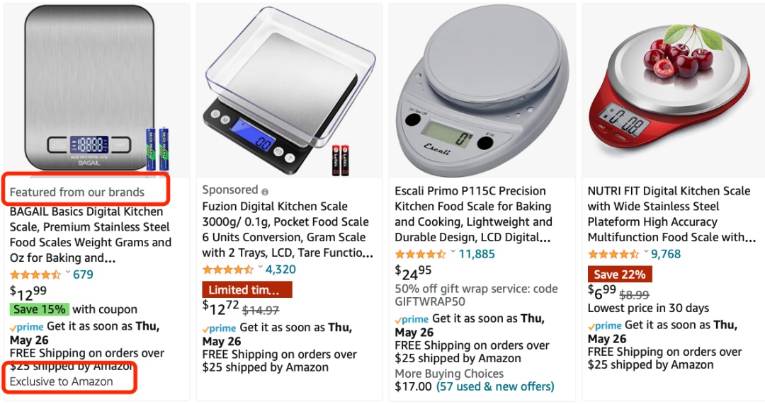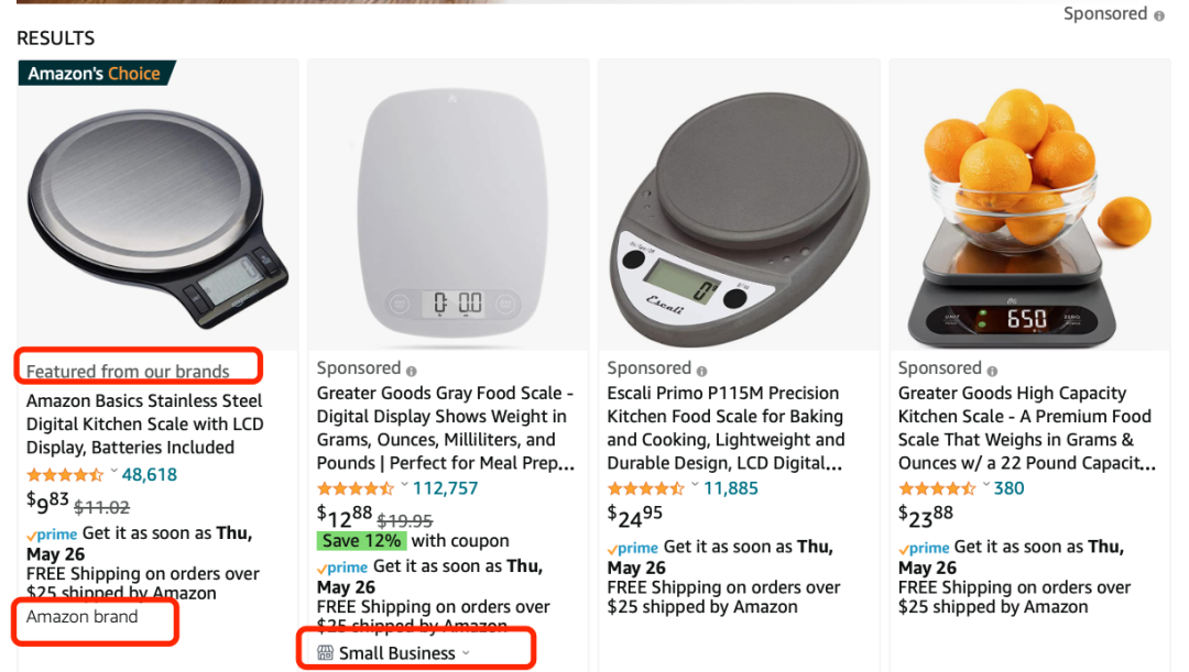 大家可以看看你所在的品类、产品线,带有亚马逊自营品牌标签的产品,很多都排在第一位。哪怕是一些大家认为亚马逊自身并不擅长经验的非标品,它的自营品牌标签产品搜索结果都排在类目Best Seller和Amazon's Choice产品前边。