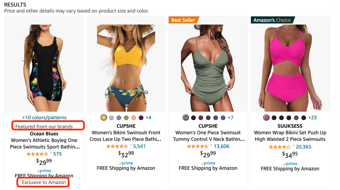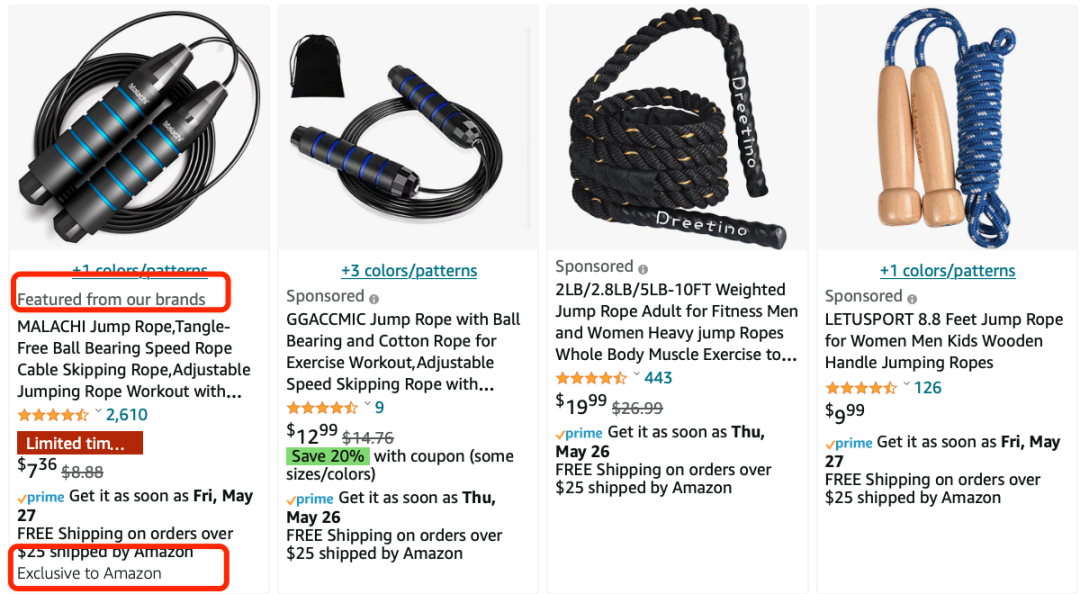 除了Amazon Brand,亚马逊另一类直营品牌,称之为"Exclusive to Amazon",现在也有了单独的标签,和Amazon Brand一样,在搜索结果中位于产品下方,搜索结果往往也排在SP广告的位置,和投放SP广告的产品在同一纬度抢流量。