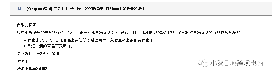 从下个月8号起,Coupang不再接受自发货上架,只能接受CGF/CGFlite 产品。