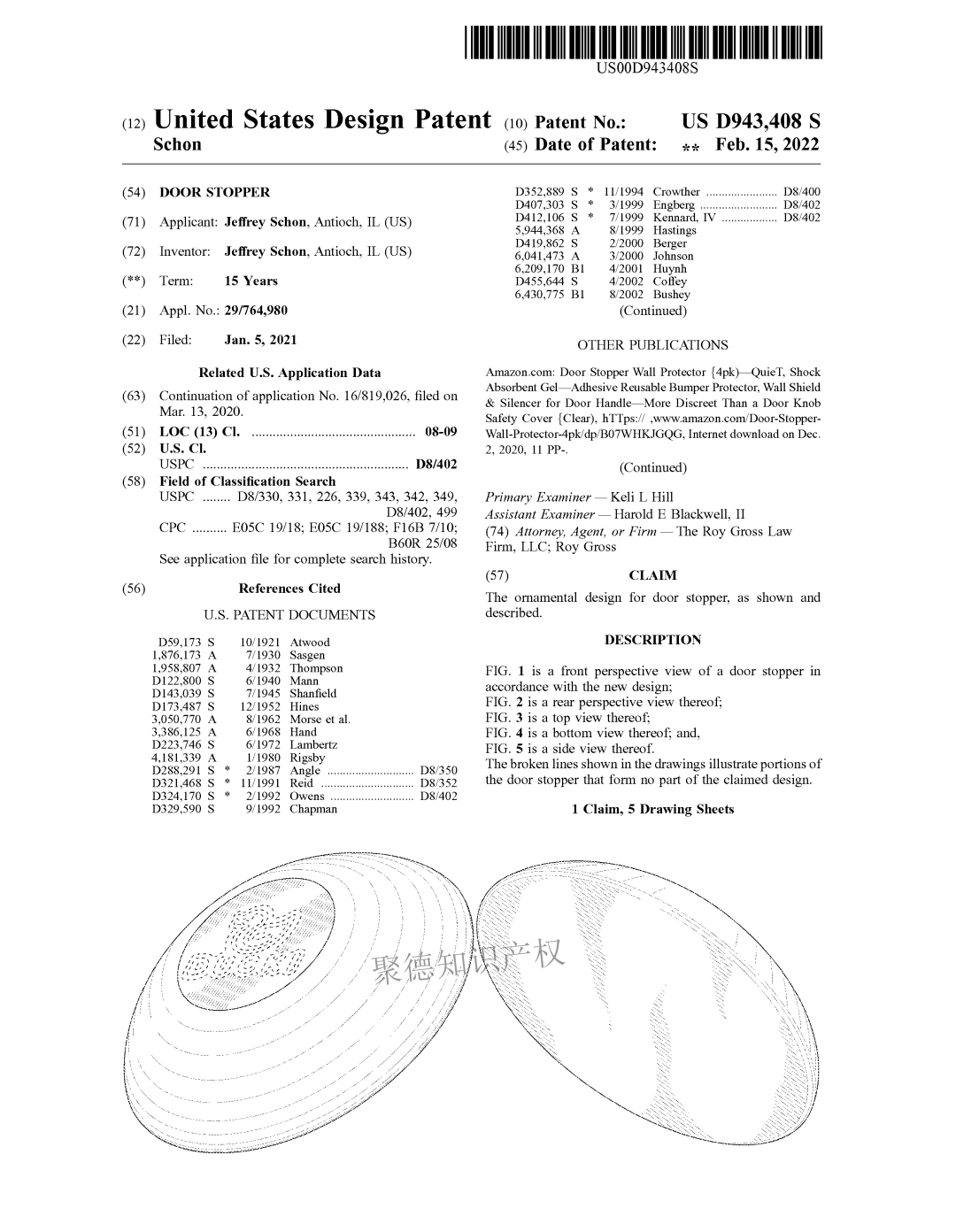 Jeffrey Schon是以个人名义提起诉讼,本案涉及的美国专利号为D943408,名为"门挡",于2022年2月5日正式下证。