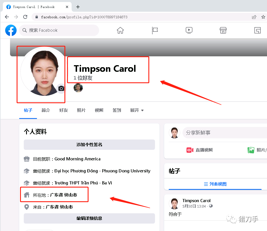 1、这个Facebook账号的头像。很明显就应该是身份证照片的头像,他们至少是同一个人。这个不能是似是而非,因为现在的扫描技术非常的成熟。