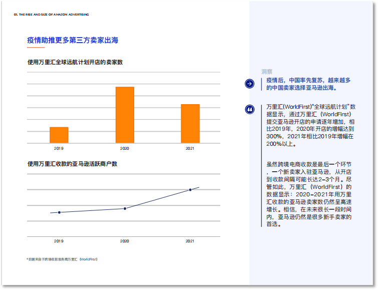 广告业务的业绩增长,离不开我们第三方卖家的贡献!比如万里汇的全球远航计划开店的卖家数,在20年疫情刚开始的时候达到了一个数值高点,2020年开店的卖家人数增幅达到了300%,2019年到2021年,使用万里汇收款的卖家数呈现持续上涨趋势……
