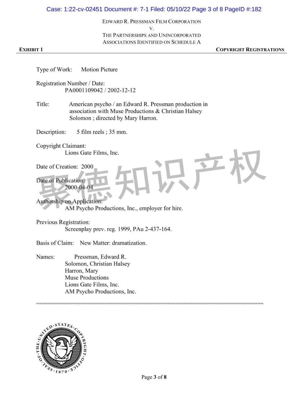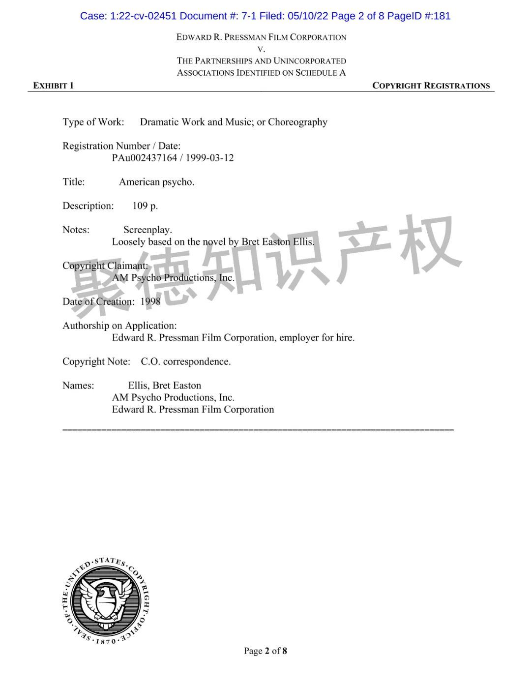 《American psycho》具有7件美国版权,分别在1998年、1999年、2002年获得版权证书。