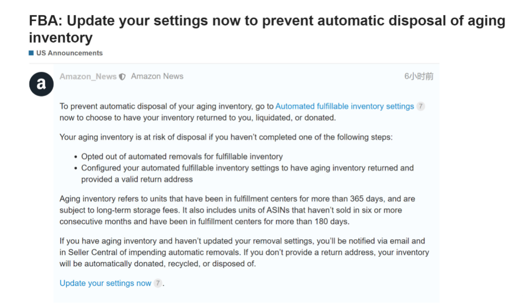 亚马逊美国站发布公告提醒卖家设置自动清除可交付库存设置,否则卖家的老化库存将被亚马逊自动清除,以下是公告内容: