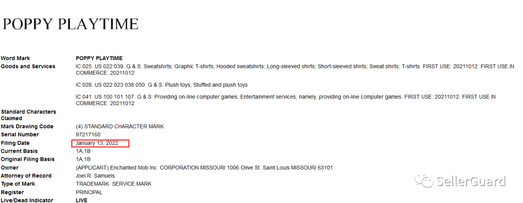 Poppy Playtime是由美国独立开发商MOB Games开发和发行的生存恐怖视频游戏,于2021年10月12日在PC端发行。游戏发行方Enchanted Mob Inc.在今年1月份注册下来文字商标Poppy Playtime,除了这个商标,案件还起诉游戏中的形象版权!一共有5个注册的形象版权: