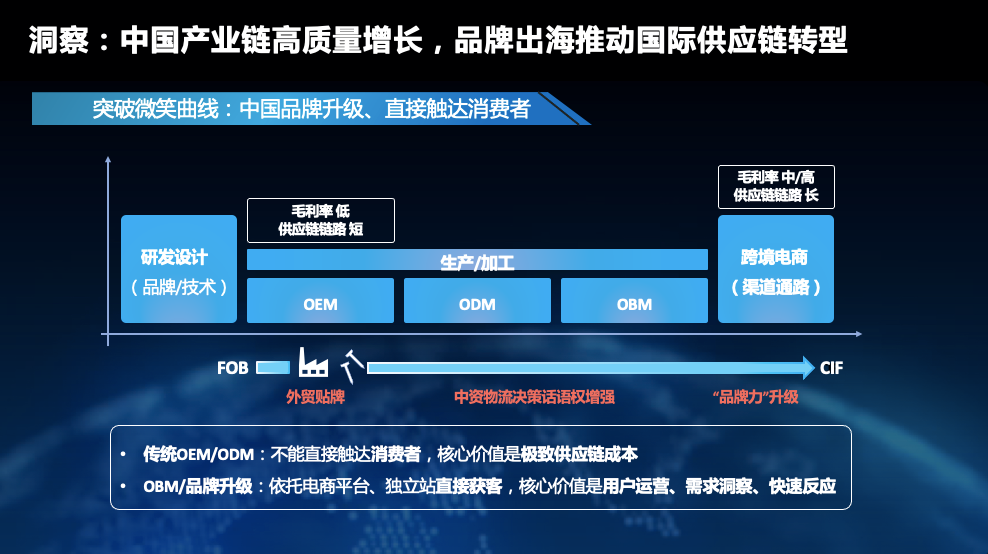 "我们观察到,越来越多的代工、贴牌生产开始转型做自主品牌出海,加大创新与研发投入,不断向'微笑曲线'两端延伸。"赵剑告诉记者,以前,传统OEM和ODM往往不能直达消费者,了解消费洞察。如今,中国工厂和工贸一体商家依托跨境电商和独立站直达消费者,对物流的话语权增强。由此,形成需求-设计-制造-物流的闭环供应链,需要更加高效、稳定、高质量的国际供应链服务。