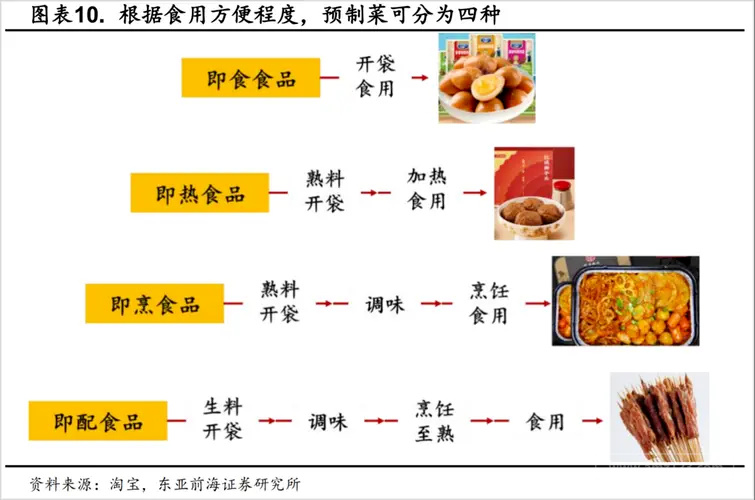 目前,市面上预制菜大致可以分为4类,根据食用方便程度,分别为即食食品、即热食品、即烹食品、即配食品。