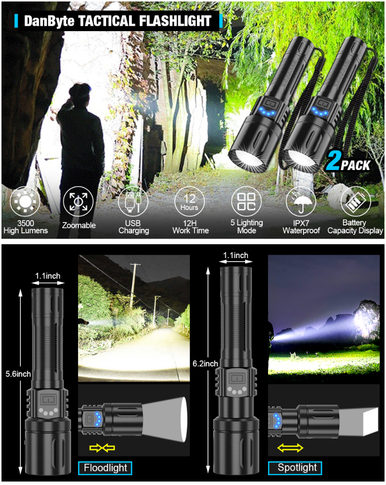 高流明和可调节焦点 ---- 3500 流明(最大)的黑暗破坏能力,能见度高达 3280 英尺。升级后的 XHP50 V2.0 LED,使用寿命达 60,000 小时,比其他原装可充电手电筒亮 10 倍。这款高流明战术手电使用顶部调节灯光直径,可轻松在泛光灯和聚光灯之间切换。
