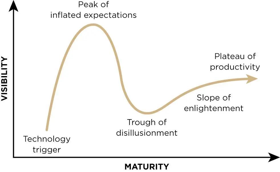信息科技产业最著名的咨询公司 Gartner 提出过一个"炒作周期"(Hype Cycle),又称"技术成熟度曲线"。任何新技术,以及基于技术的商业模式,都会经历以下五个阶段。