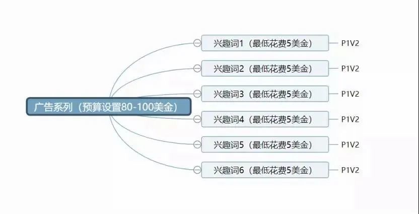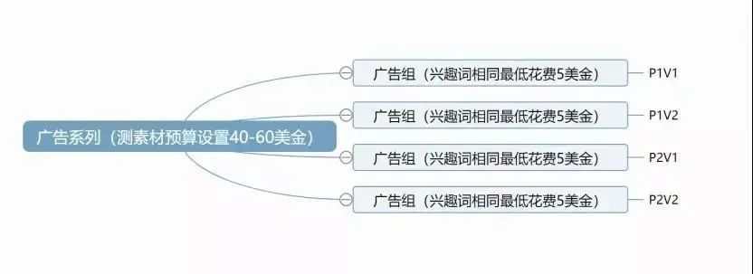 当确定好产品后,第一步就是要测试出最优秀的广告素材(P代表广告图,V代表视频素材)。广告系列设置40-60美金,广告组设置最低花费5美金,剩余的预算交给FB,兴趣标签选择你认为是最好的那个,四个广告组设置一样的,起跑时间设置零点开始。