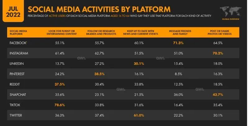 数据显示,在 TikTok 上消费有趣和有趣的内容仍然是最热门的活动,国外的工作年龄成年人中,有 35.4% 的人表示他们在平台上发布或分享了自己的内容。