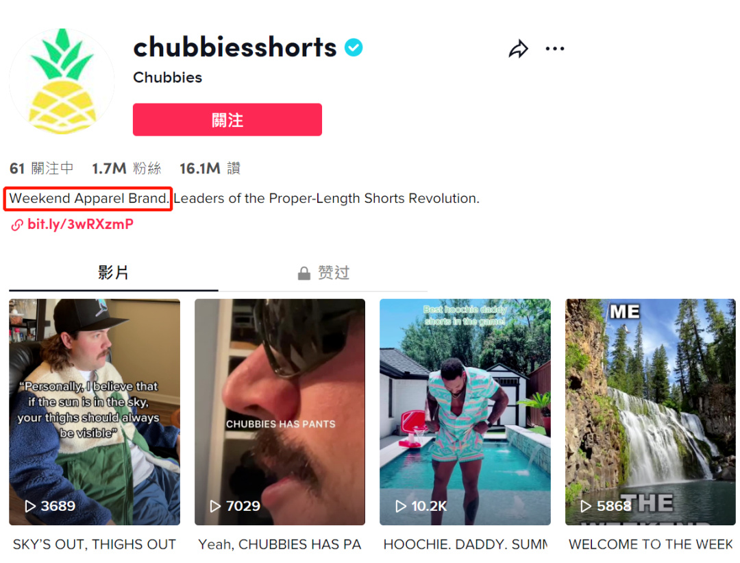 在各大社交平台,如Instagram、Tik Tok的简介处,Chubbies称自己为"Weekend Apparel Brand",即周末服装品牌。
