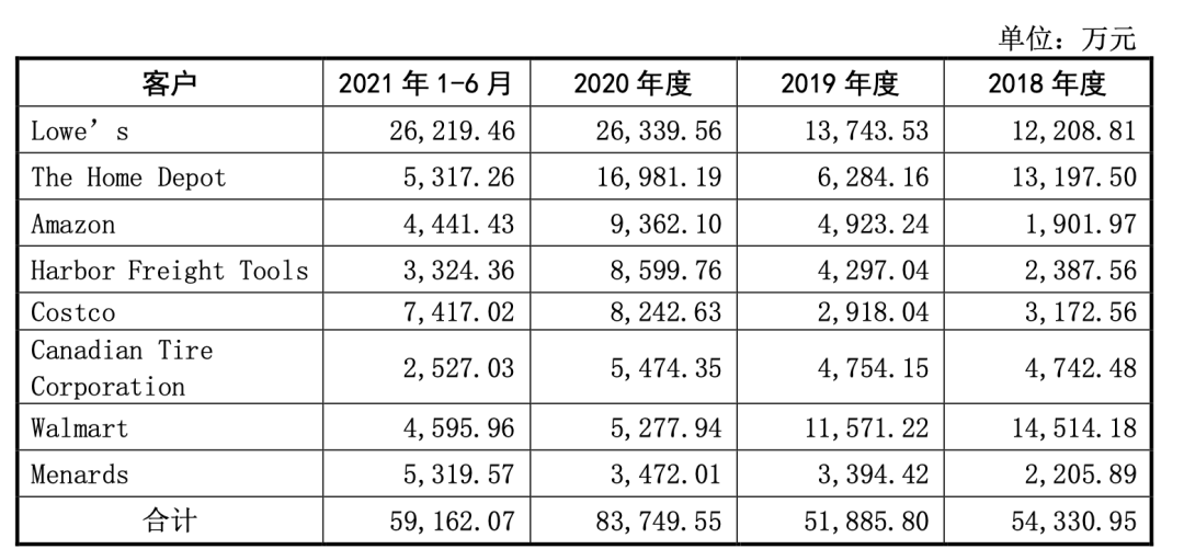 2018-2020年,以及2021年上半年,欧圣电气在各个销售渠道的细分收入如下,家居零售巨头Lowe's、The Home Depot、Costco,综合电商巨头Amazon、Walmart,销量贡献排名前列。