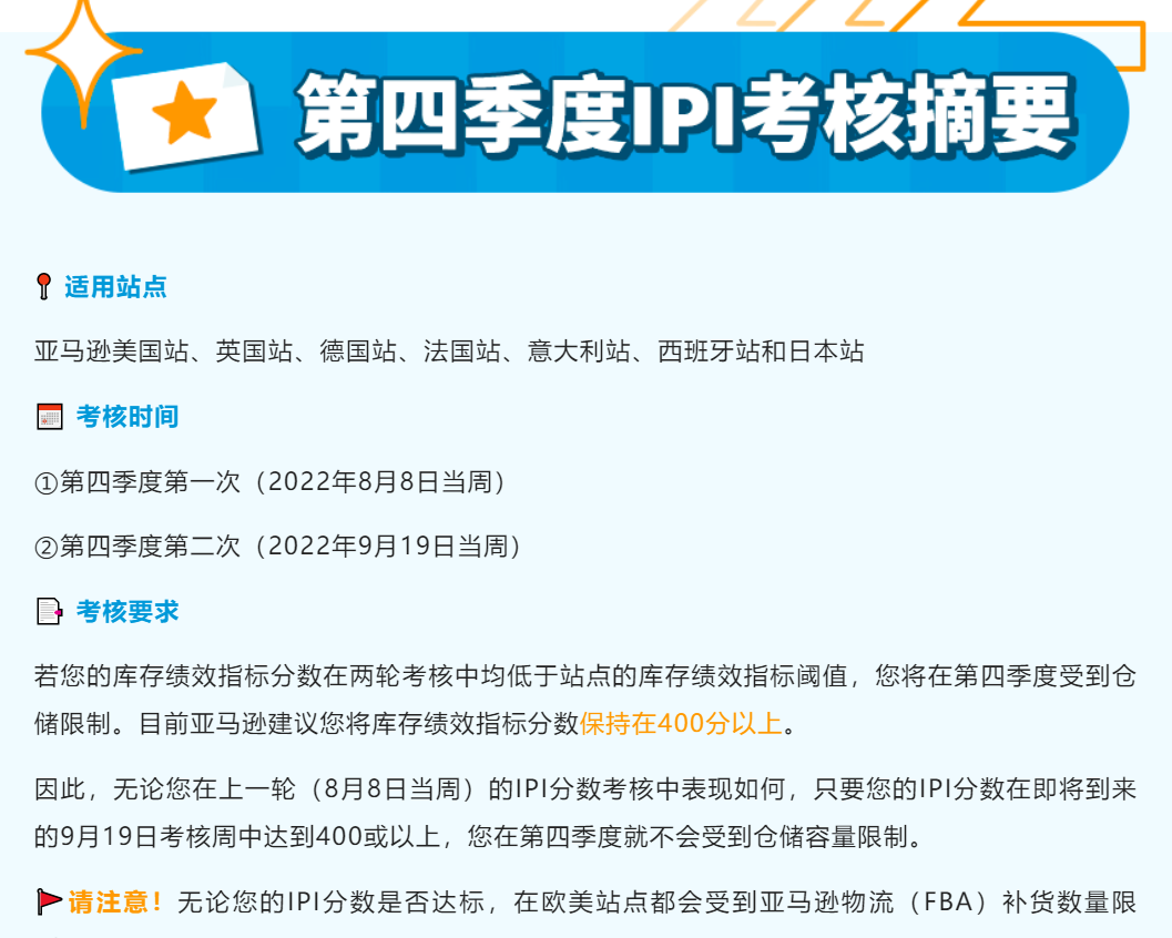 黑五网一大促即将来袭!与库容量息息相关的IPI分数考核来了,亚马逊发公告提示,9月19日当周进行的亚马逊物流(FBA)第四季度最后一次IPI考核!为了确保第四季度拥有无限量仓储空间,用于库存周转,卖家一定要注意起来。