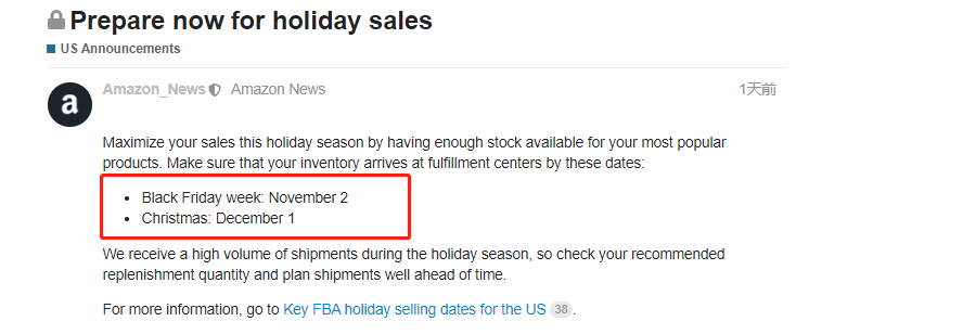 昨日,亚马逊美国站和欧洲站发布了黑五和圣诞库存最晚入仓时间,提醒美国站和欧洲站卖家,确保在规定日期前将货件送达亚马逊配送中心。