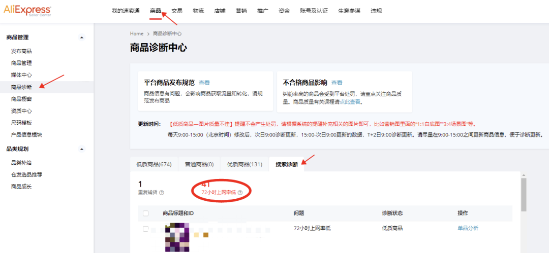 1)商家朋友可以在速卖通商家后台【商品】-【商品诊断】腰封位置-【搜索诊断】查询72小时上网率低的商品标题及ID,您可以点击【操作】下的【单品分析】跳转后直接查询对应商品上网率数据值、下载商品不达标订单明细;