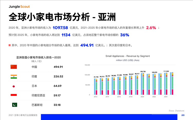 根据JungleScout发布的《2021年全球小家电行业发展报告》,2020年亚洲小家电的收入为1097.58亿美元,其中,中国小家电的细分市场收入最高,达到494.91亿美元,约合人民币3416亿元。