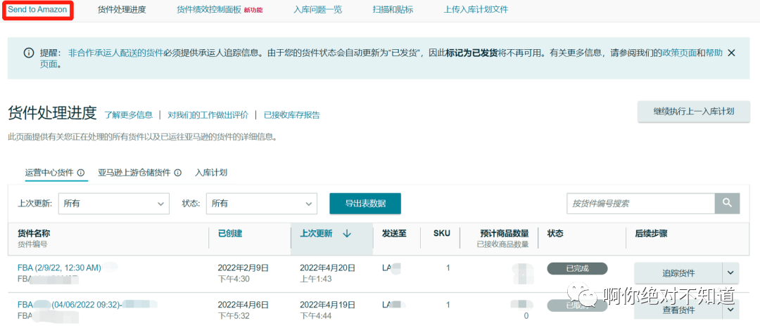 操作步骤详解登录亚马逊卖家平台点击【库存>管理亚马逊货件】在页面顶端选择【Send to Amazon】在Send to Amazon页面上,按照页面提供的步骤完成创建货件。