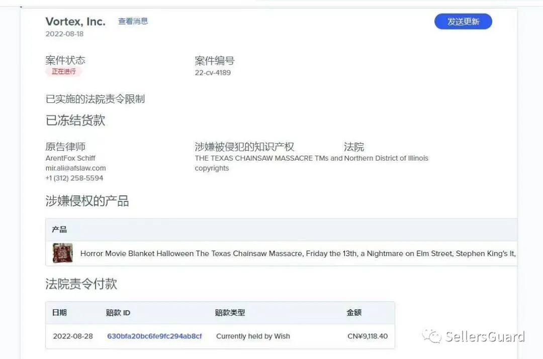 过几天就是欧美国家一年一度的万圣节了,据卖家冻结反馈我们发现了一个万圣节恐怖元素相关的电影已经发起立案维权,虽然目前该案的文件还是隐匿状态,但我们从冻结令页面已经可以清晰的看出品牌了,维权的是电影作品《The texas chainsaw massacre德州电锯杀人狂》。