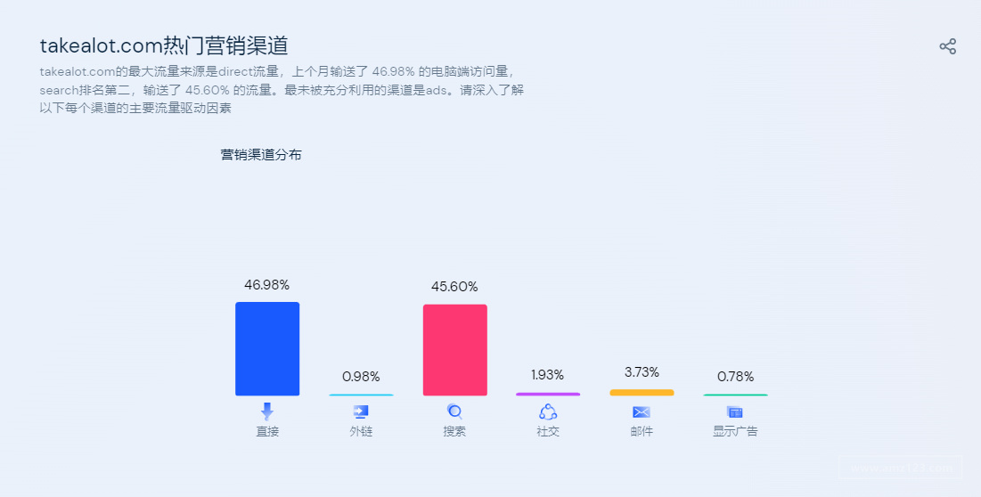 takealot.com接收的流量来自direct (46.98%) 和search(45.60%),尚未充分利用的渠道是"ads"(PC 端,全球范围)。