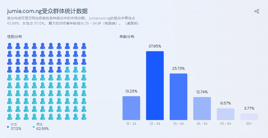 jumia.com.ng的受众中,男性占62.88%,女性占37.12%。网站最大的访问群组是年龄在25-34岁的人(PC端)。