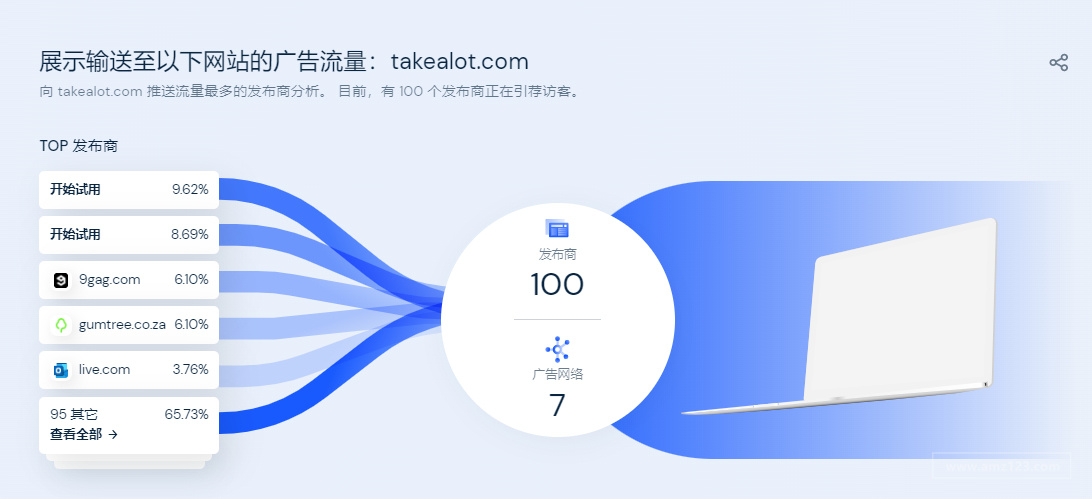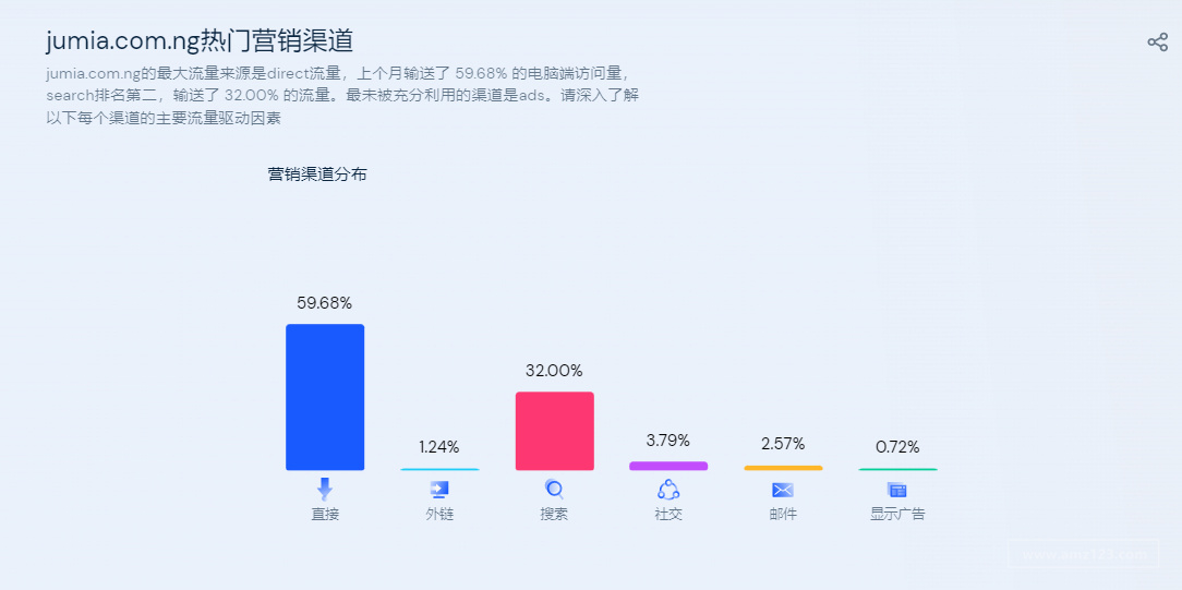 接收的流量来自direct (59.68%) 和search(32.00%),尚未充分利用的渠道是"ads"(PC 端,全球范围)。