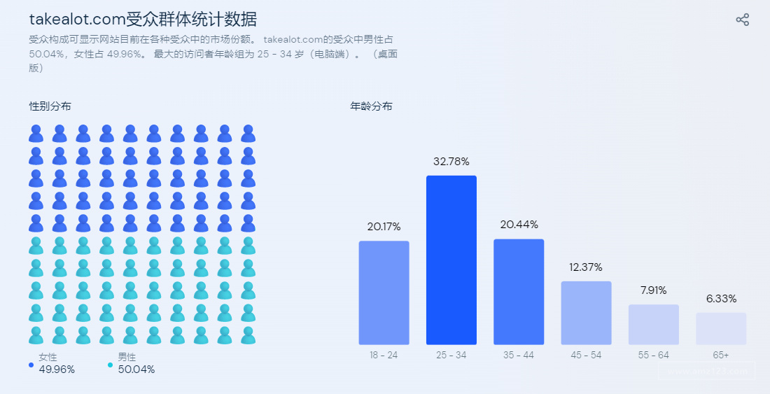 takealot.com的受众中,男性占50.04%,女性占49.96%。网站最大的访问群组是年龄在25-34岁的人(PC端)。