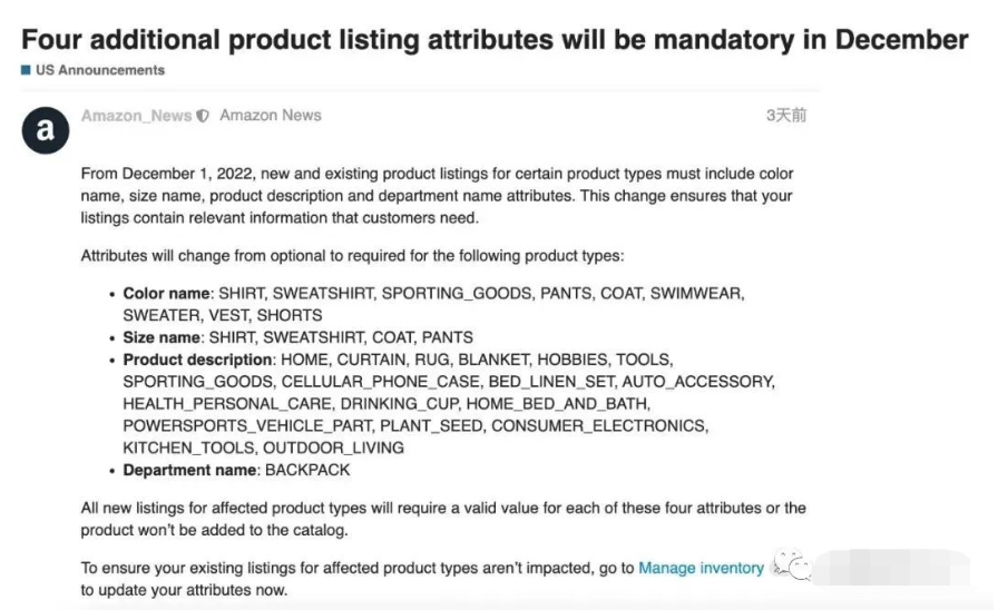 近日:亚马逊美国站、欧洲站、日本站同时发布公告称,从 2022 年 12 月 1 日起,某些产品类型的新产品和现有产品listing必须包含颜色名称、尺寸名称、产品描述和所属类别名称属性。![]()